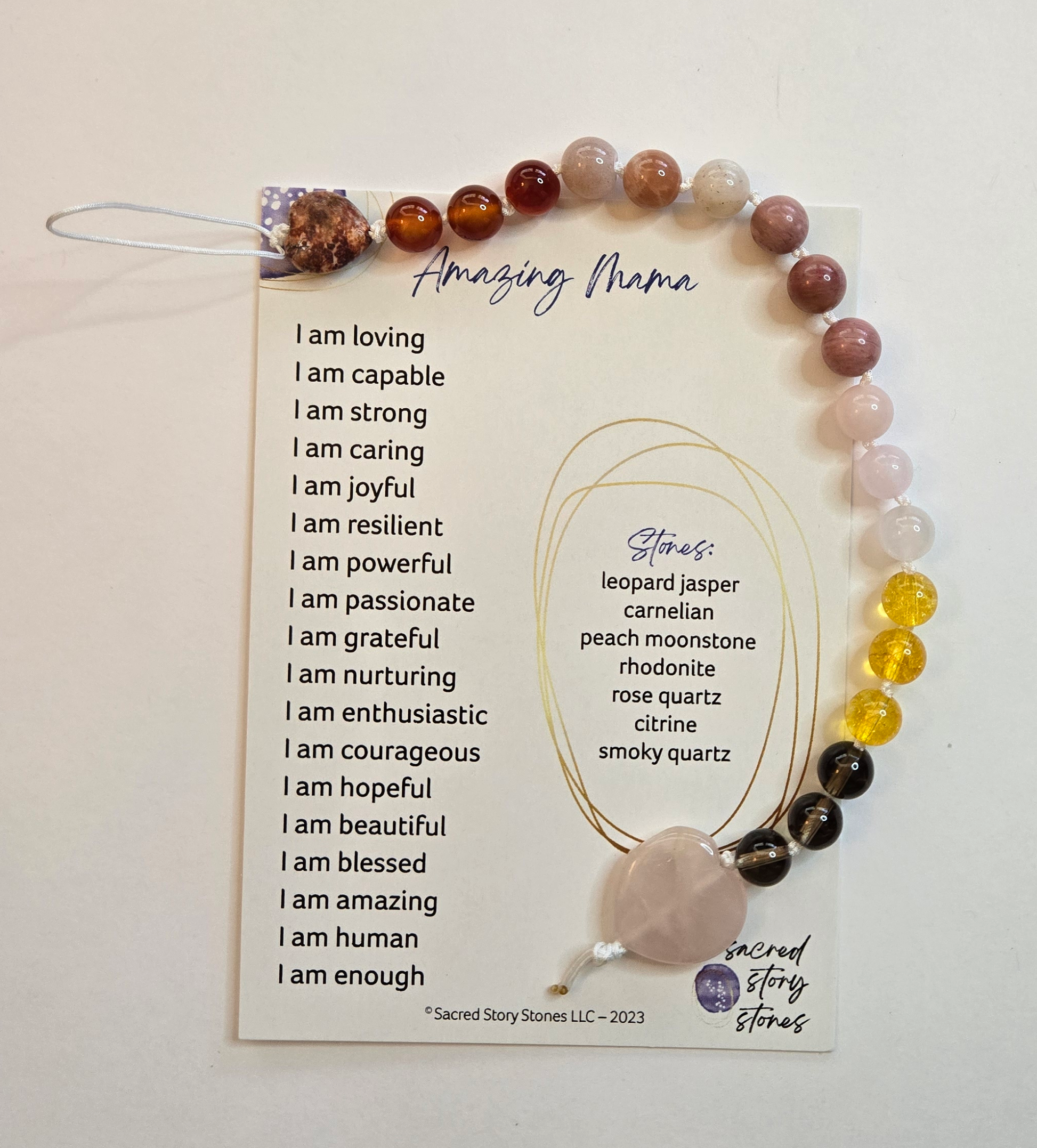 Isn't every mother you know amazing? And isn't it interesting that most of them doubt themselves because it's a hard job, to say the least. So let's give it up for all mamas everywhere. The perfect baby shower gift, baby gift, or anytime gift to a mama or expecting mama you know and love. The calming, loving, and empowering afirmations with this Story String include "I am beautiful, I am blessed, I am capable, I am enough." This Story String will find a perfect place hung by your mirror, in your bedroom, car, or close by in your pocket when you need some encouragement. The semi-precious stones on this Story String include leopard jasper, carnelian, sunstone, rhodolite, rose quartz, citrine, and smoky quartz. Because the beads are all natural, semi-precious stones, they will have variations in color and patterns. This is what makes your Story String unique!