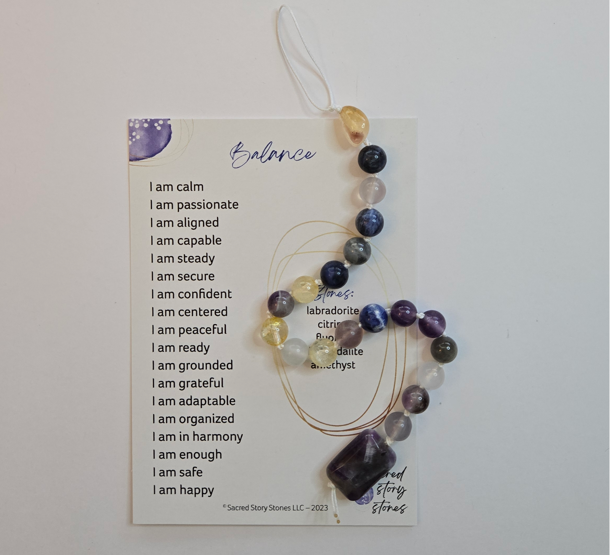 Who couldn't use a little more balance in their life? Regardless of whether you feel like you already live a balanced life, it's always a great reminder to reinforce positive messages that keep us grounded, calm, and safe. This Story String will find a perfect place in your pocket, your car, your office, or your meditation practice. Great for a gift for yourself or any friend or loved one who has a lot going on and strives for balance. The semi-precious stones on this Story String include citrine, flourite, blue sodalite, and amethyst. Because the beads are all natural, semi-precious stones, they will have variations in color and patterns. This is what makes your Story String unique!