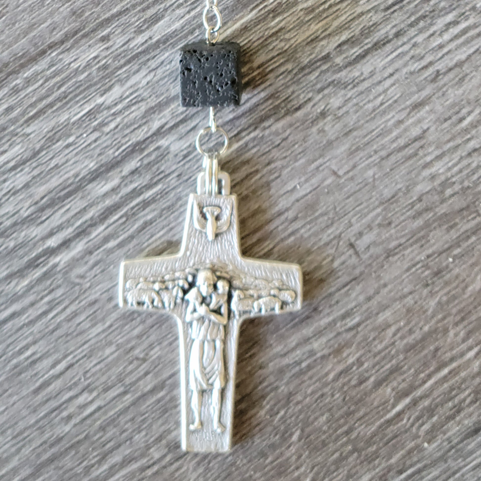 This striking rosary has black jasper, snowflake jasper, and beautiful, translucent grey labradorite Hail Mary beads. Black lava stone cubes are the Our Father beads. Silver toned centerpiece and official Pope Francis crucifix (good shepherd) which is made in Italy. Rosary is handmade in the US and only one available. Round beads are 8 mm and black cube beads are 12 mm. Total rosary is approximately 24-25"