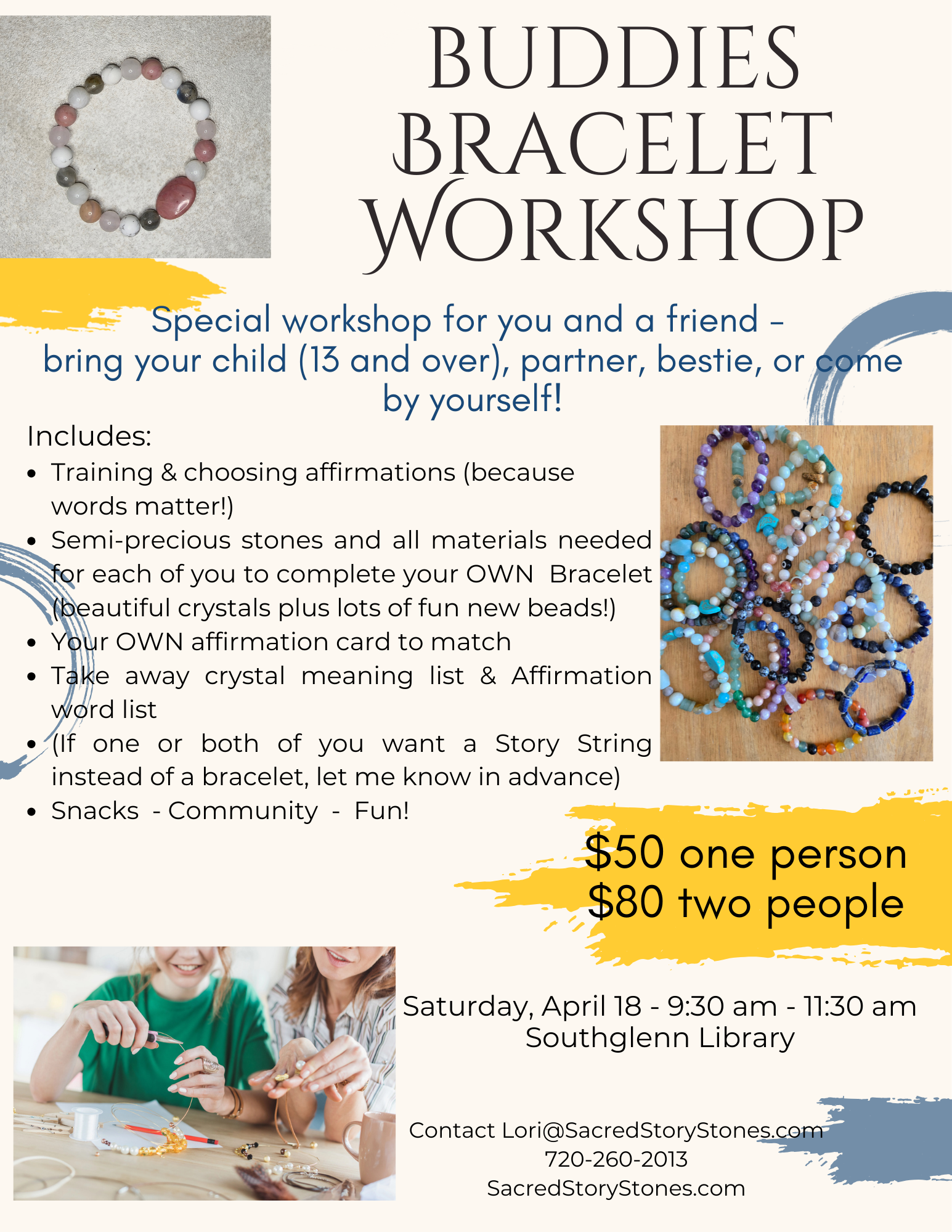 Another in person workshop - this one by popular request! Buddies Bracelet Workshop on April 18. Make your own affirmation bracelets - AND bring a friend, a child 13 and older, or come by yourself. Learn about affirmations, write your own, design and make your own custom bracelets (each of you) with tons of fun and beautiful choices of semi-precious crystals and stones, snacks and more!