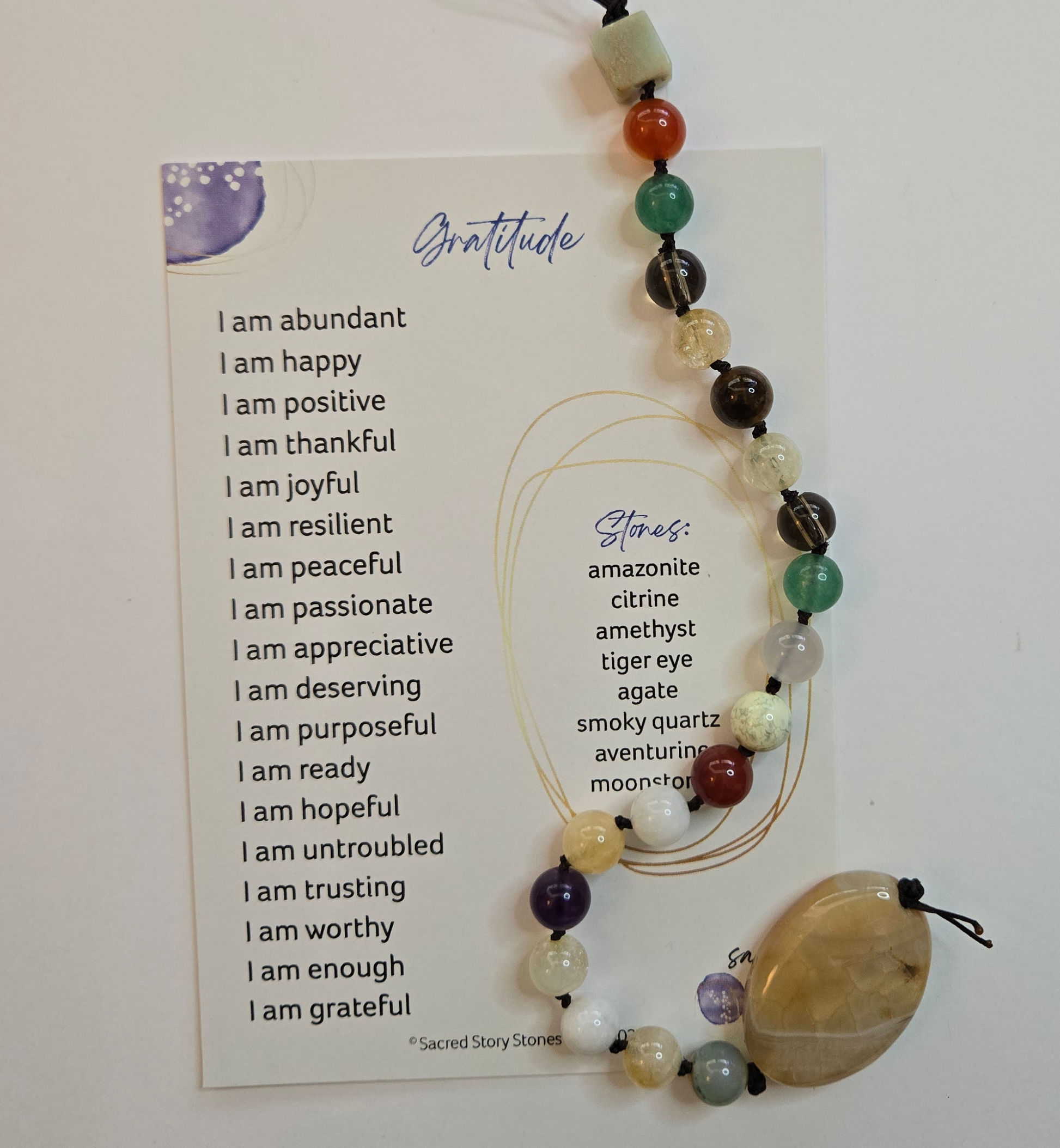 Some of us believe that simply practicing more gratitude can change the world. Do you? It can definitely improve your outlook, at a minimum! The perfect companion for your daily gratitude journaling or morning spiritual practice or prayers. The Gratitude Story String has a sister named “Grateful,” which looks different but has the same affirmations. Gratitude has more earthy tones, while Grateful is lighter and more pastel shades. Either one will find a perfect place in your pocket, your car, your office, or your meditation practice. Great for a gift for yourself or any friend or loved one. The semi-precious stones on this Story String include amazonite, citrine, smoky quartz, amethyst, aventurine, tiger eye, moonstone, and agate. Because the beads are all natural, semi-precious stones, they will have variations in color and patterns. This is what makes your Story String unique!