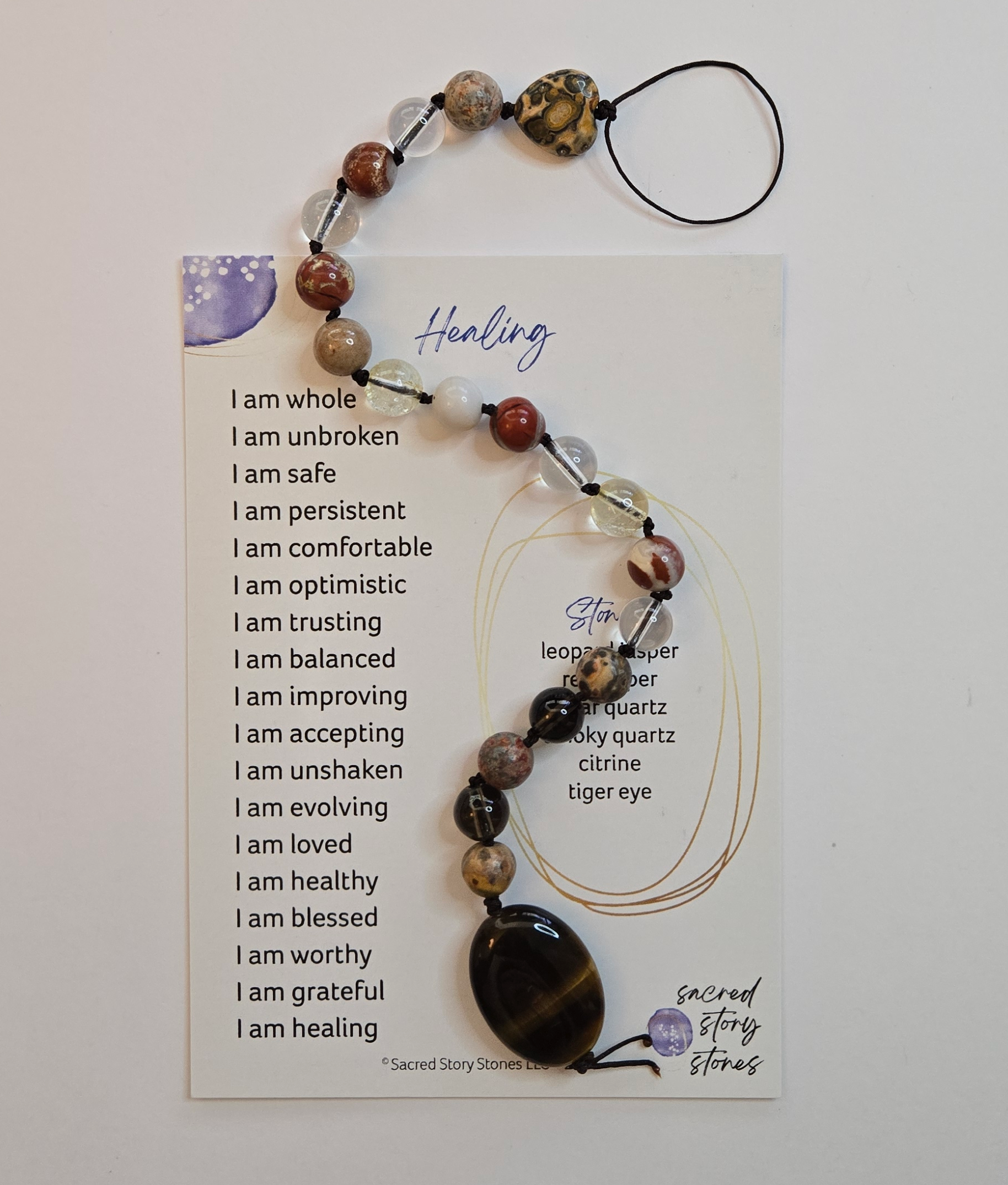Whether from physical pain or emotional distress, healing can feel heavy, and hard. The Healing Story String is designed to lift you up, help you feel safe and unbroken, and realize you are constantly getting stronger. This Story String will find a perfect place in your pocket, your car, your office, or your meditation practice. Great for a gift for yourself or any friend or loved one going through a life transition, post-surgery or illness, or struggling with anything that feels discouraging. The semi-precious stones on this Story String include leopard jasper, red jasper, clear quartz, smoky quartz, citrine, and tiger eye. Because the beads are all natural, semi-precious stones, they will have variations in color and patterns. This is what makes your Story String unique!