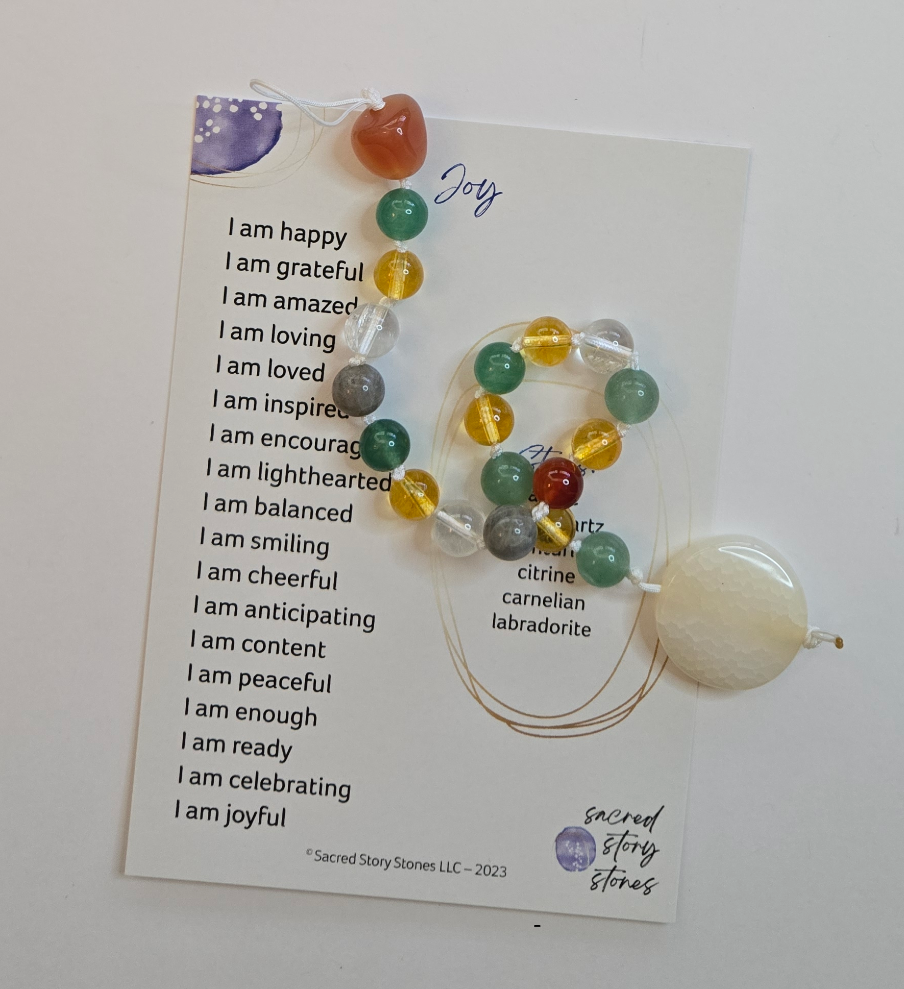 Life is joyful! Take a moment to remember that. Are you one of those people who is constantly happy, or do you need to consciously look for the joy in life? The Joy Story String is a beautiful, tangible touchstone of a joyful life. This Story String will find a perfect place in your pocket, your car, your office, or your meditation practice. Great as a gift for yourself to remind you to look for joy in every moment, or as a gift to someone else who brings joy to everyone else. The semi-precious stones on this Story String include agate, clear quartz, aventurine, citrine, carnelian, and labradorite. Because the beads are all natural, semi-precious stones, they will have variations in color and patterns. This is what makes your Story String unique!