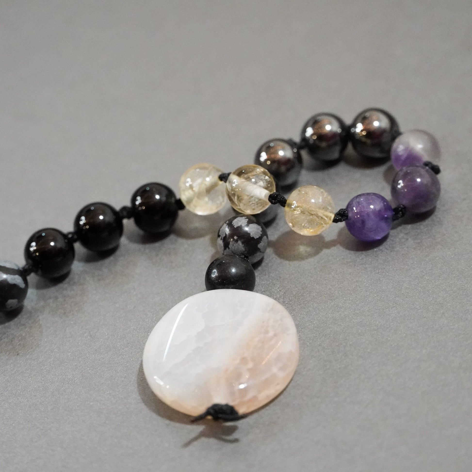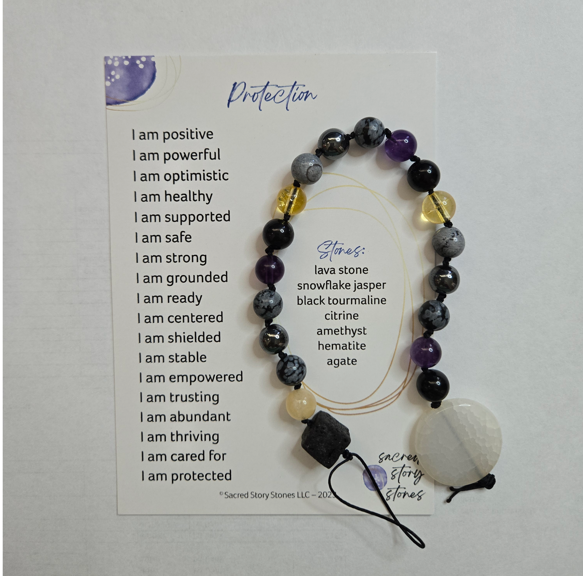 Do you ever wish you had an invisible shield to protect you from negative energy, bad luck, illness, and icky people? You do, if you use it! We designed Protection to remind you that you really do walk around with this invisible shield – it’s called positive thinking. The stones chosen for Protection and the affirmations that accompany it are powerful positive thoughts. Keep it where you can see it – in your car, your home, or near your body. Great for a gift for yourself or any friend or loved one. The semi-precious stones on this Story String include lava stone, snowflake jasper, black jasper, citrine, amethyst, hematite, and agate. Because the beads are all natural, semi-precious stones, they will have variations in color and patterns. This is what makes your Story String unique!!