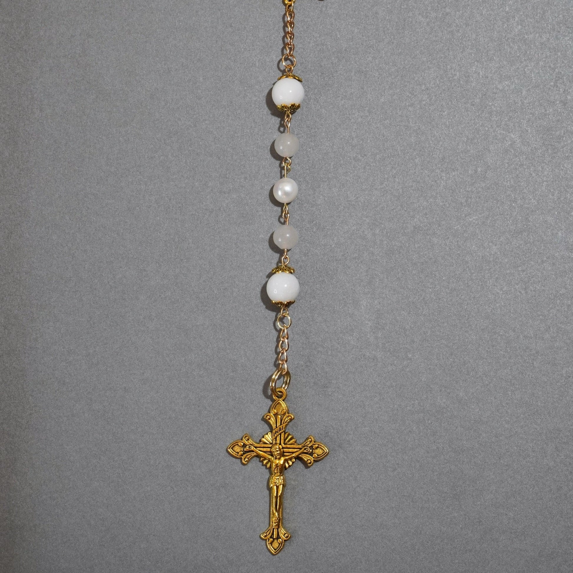This rosary features rose quartz and freshwater pearl Hail Mary beads, accentuated with white jade Our Father beads with gold colored bead caps, and a gold colored centerpiece and crucifix. It is handmade, and possesses an ethereal quality with the pale pink rose quartz combined with the translucent pearls. It is approximately 23" long from top of loop to bottom of crucifix. Great gift idea!