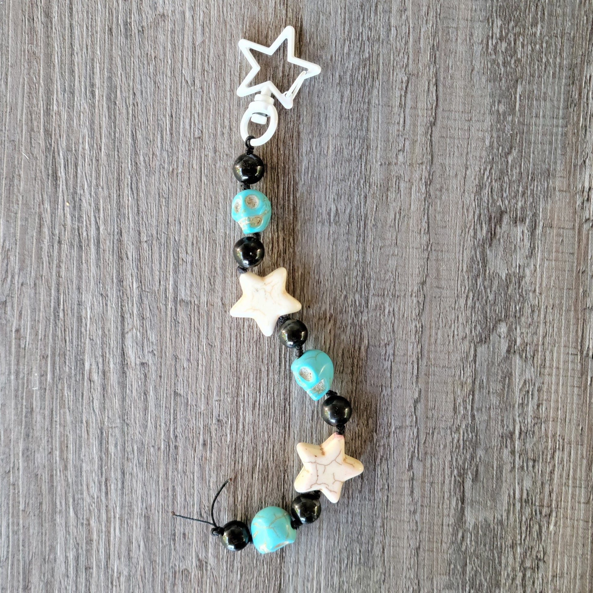 A little bit edgy, a little bit bright, and a lot of fun, this combination of howlite skulls and stars and black tourmaline beads makes a great affirmation string. Comes with a printed affirmation card with five magical affirmations (to match the five larger stones beads) printed on the front for your favorite young person, and spaces to write their own affirmations on the back of the card. Choose between two versions of affirmation cards - See card #1 and #2 in the photos. The white star clasp makes it easy to attach to a backpack or hang in their bedroom or anywhere. Approximately 7.25 inches long from top to bottom. Because the beads are all natural stones, they may have slight variations in color and patterns. This is what makes your Story String unique!