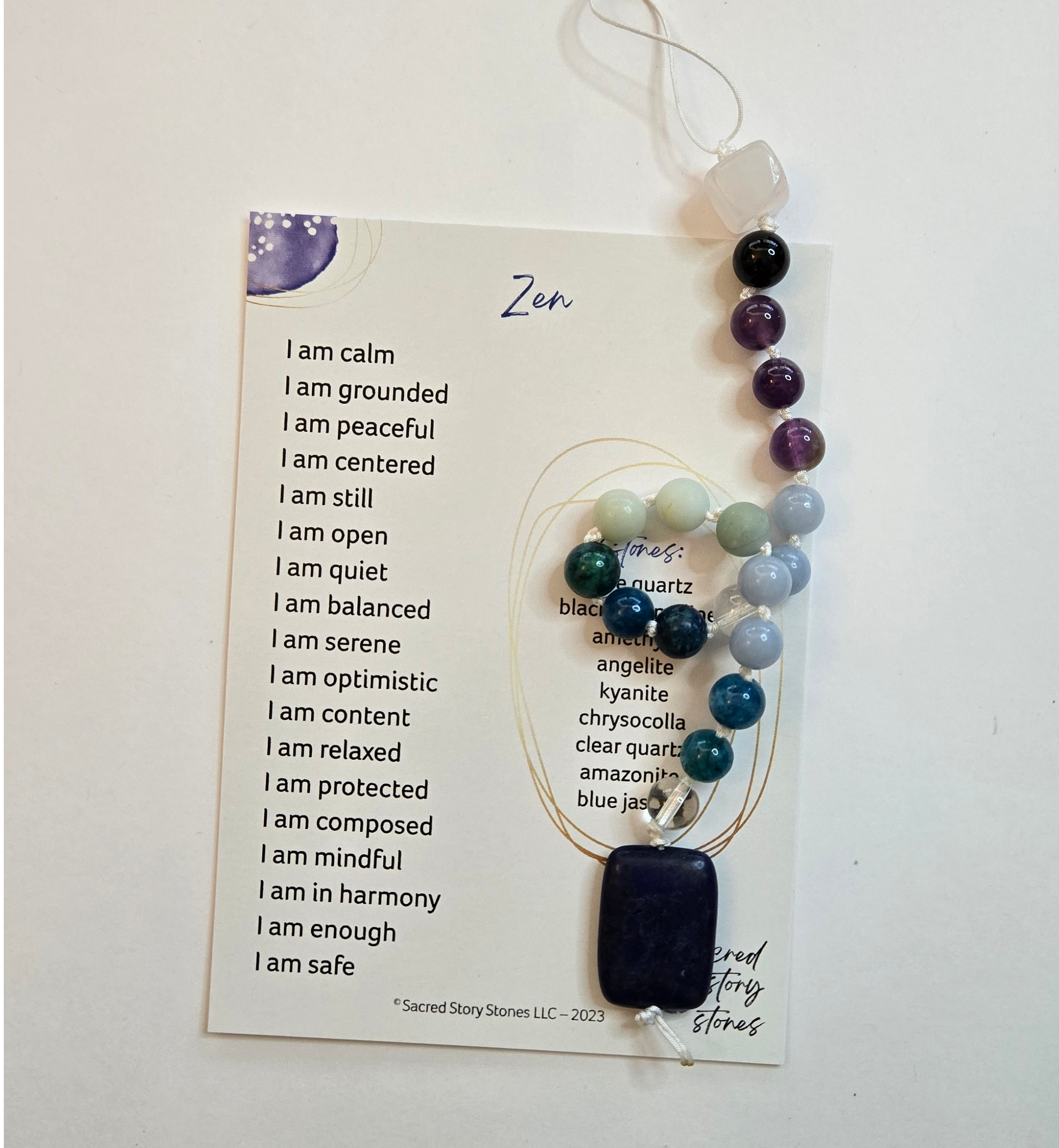 When life is calm and peaceful, celebrate it. Because life isn't always like that, right? When life is hectic or anxiety-filled, finding ways to ground and calm ourselves down is helpful Let the Zen Story String(TM) help you out. The calming, loving, and grounding affirmations with this Story String include "I am peaceful, I am protected, I am safe." This Story String will find a perfect place hung by your mirror, in your bedroom, car, or close by in your pocket when you need some encouragement. The semi-precious stones on this Story String include rose quartz, black tourmaline, amethyst, angelite, kyanite, chrysocolla, clear quartz, amazonite, and blue jasper. Because the beads are all natural, semi-precious stones, they will have variations in color and patterns. This is what makes your Story String unique!